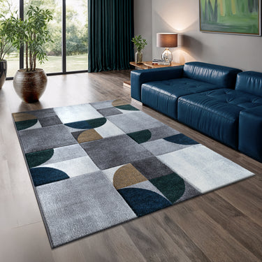 Refresh your space with the Trendy Geo Blocks Grey & Navy Rug, featuring a bold grid layout of geometric forms in grey, navy, deep green, and beige. This contemporary statement rug is perfect for modern homes, bringing contrast and balance with its symmetrical layout and deep tones. Made in Turkey, this rug is crafted from durable, easy-care fibres that are soft underfoot yet built to handle busy family living.